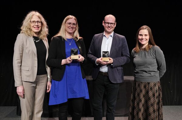 Carbfix og Controlant hlutu Teninginn, viðurkenningu Verkfræðingafélags Íslands fyrir framúrskarandi verkefni eða framkvæmd, þegar hann var afhentur í fyrsta sinn á Degi verkfræðinnar sem haldinn var á Hótel Nordica 22. október. Dagur verkfræðinnar var sem fyrr mjög vel sóttur og fullt hús. Á myndinni eru frá vinstri: Svana Helen Björnsdóttir, formaður VFÍ, Edda Sif Pind Aradóttir, framkvæmdastjóri Carbfix, Guðmundur Árnason, fjármálastjóri Controlant og Katrín Jakobsdóttir forsætisráðherra.