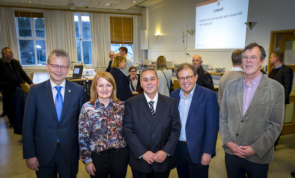 Myndin er frá opnunarathöfn Tæknifræðiseturs HÍ. Frá vinstri: Jón Atli Benediktsson rektor Háskóla Íslands, Rósa Guðbjartsdóttir bæjarstjóri í Hafnarfirði, Karl Sölvi Guðmundsson dósent við Rafmagns- og tölvuverkfræðideild Háskóla Íslands og forstöðumaður setursins, Kristinn Andersen deildarforseti Rafmagns- og tölvuverkfræðideildar og Hjálmar Árnason framkvæmdastjóri Keilis. MYND/Kristinn Ingvarson.