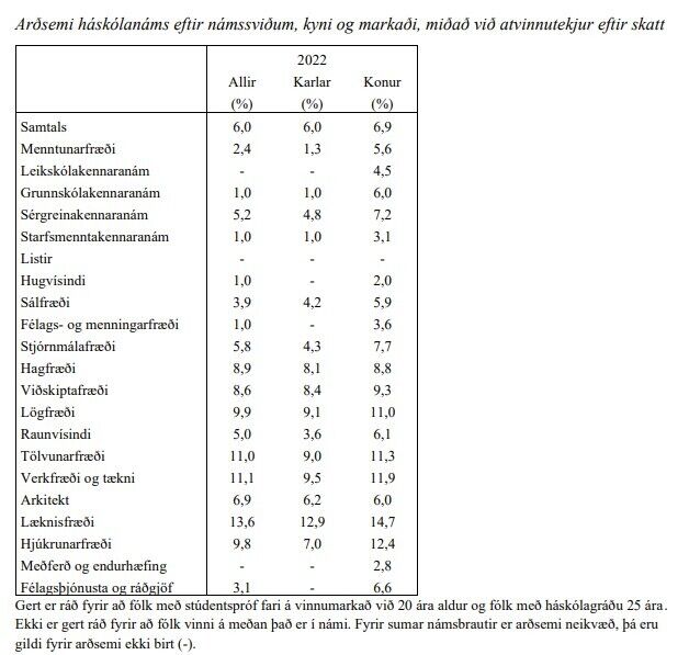 Áhugavert er að rýna í myndina hér að neðan sem sýnir arðsemi háskólanáms eftir sérsviðum.