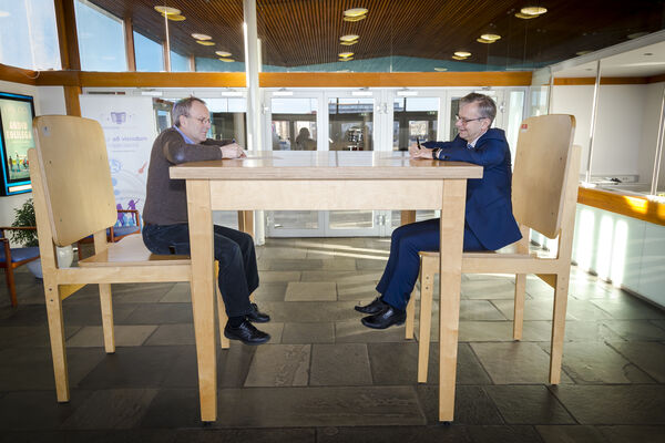 Myndin er frá undirritun samningsins. Páll Gíslason formaður Verkfræðingafélags Íslands og Jón Atli Benediktsson rektor Háskóla Íslands undirrita samninginn við risaborðið í Vísindasmiðjunni. Hlutföllin eru eins og fjögurra ára börn sitji við borð í venjulegri stærð. Mynd/Kristinn Ingvarsson.