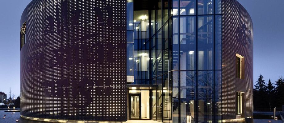 Byggingin er hin glæsilegasta, formið er sporöskjulaga og brotið upp með útskotum og innigörðum. Að utan er byggingin klædd opnum málmhjúp með skreytingum af handritunum. Húsið er á þremur hæðum auk kjallara undir hluta hússins og opins bílakjallara. (Heimild: verkis.is)