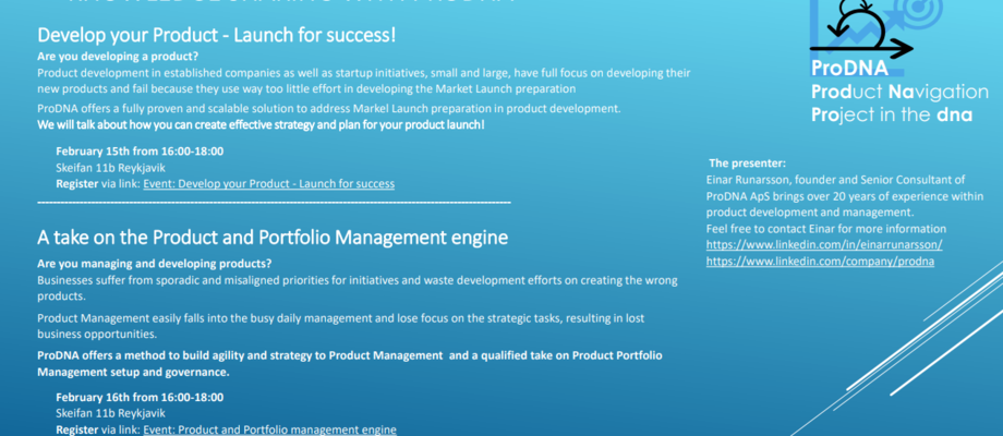 Dagana 15. og 16. febrúar verður fyrirtækið ProDNA ApS með tvo fundi um vöruþróun og markaðssetningu. Einar Rúnarsson stofnandi og ráðgjafi hjá ProDNA mun kynna lausnir fyrirtækisins en hann hefur áratugareynslu á sviði vöruþróunar og ráðgjafar. Fundirnir verða í húsakynnum Promennt, Skeifunni 11b í Reykjavík. - Félagsmenn VFÍ eru sérstaklega boðnir velkomnir.