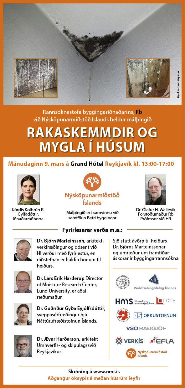 Rakaskemmdir og mygla í húsum. Málþingið er á vegum Rannsóknastofu byggingaiðnaðarins við NMÍ í samstarfi við fagaðila, þ.á.m. Verkfræðingafélag Íslands.
